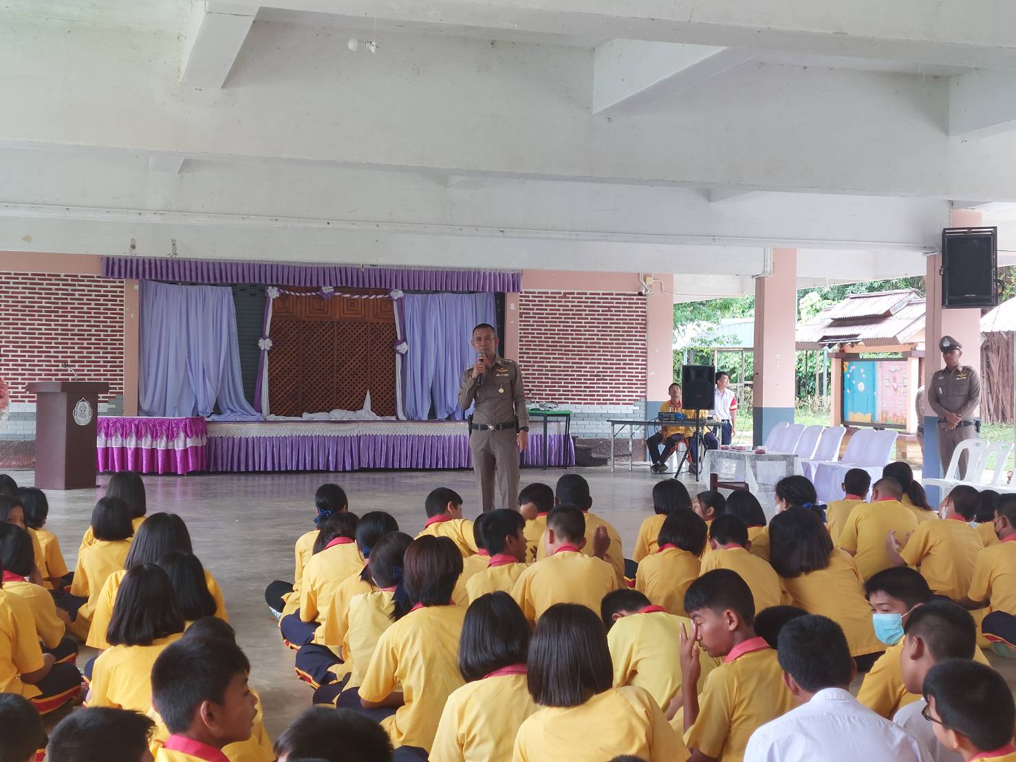 พ.ต.ท.สุรชาติ บุญโรจน์พงศ์ รอง ผกก.ป.สภ.ป่าพะยอมเป็นวิทยากรบรรยายการซักซ้อมแผนเผชิญเหตุ "หนี ซ่อน สู้" ณ โรงเรียนนิคมควนขนุนวิทยา