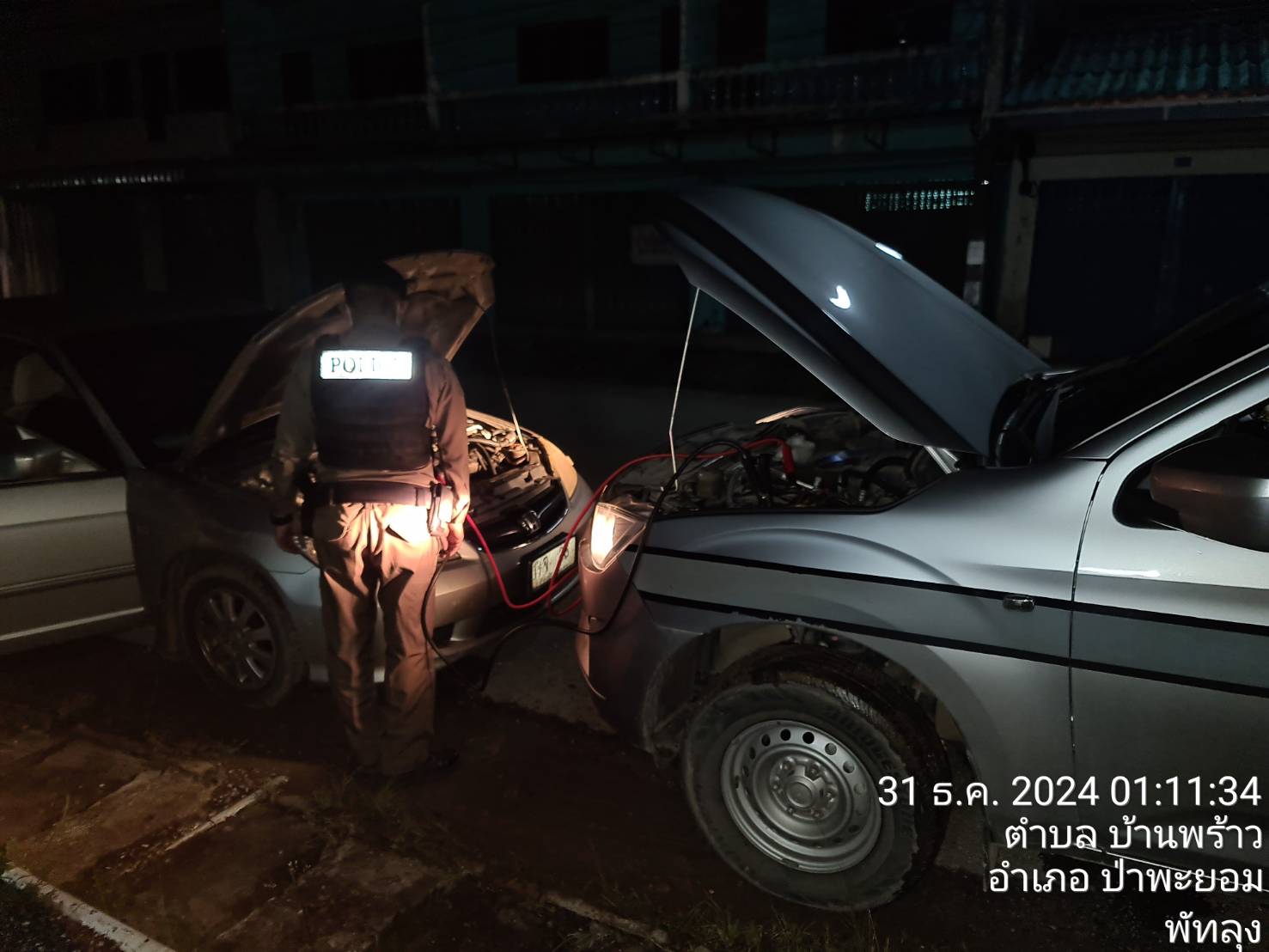 วันอังคาร ที่ 31 ธันวาคม 2567 เวลา 01.00 น. ภายใต้การอำนวยการของ พ.ต.อ.ณธรรศกร เกตุขาว ผกก.สภ.ป่าพะยอมควบคุมการปฏิบัติโดย พ.ต.ท. สุรชาติ บุญโรจน์พงศ์ รอง ผกก.ป.ฯ และ พ.ต.ท.กิตติพัศ คงศรีทอง สวป.ฯ สั่งการให้ ร.ต.อ.ประสพ เพ็ญจำรัส รอง สวป.ฯ ร้อยเวร 2-0 พร้อมด้วยสายตรวจรถยนต์ ให้ความช่วยเหลือประชาชนเหตุเหตุรถยนต์สตาร์ทไม่ติดเนื่องจากแบตเตอรี่เสื่อมสภาพ โดยการนำสายพ่วงแบตเตอรี่มาพ่วงให้รถสตาร์ทติดเรียบร้อยจนรถสามารถใช้การได้และเดินทางต่อไปได้ เหตุเกิด ณ ริมถนน ม.1 ต.บ้านพร้าว อ.ป่าพะยอม จว.พัทลุง